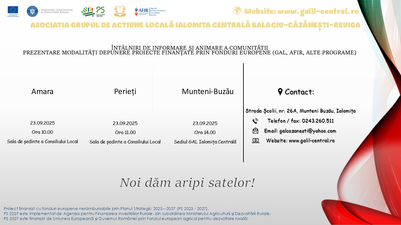 În vederea implementării Strategiei de Dezvoltare Locală a Asociației Grupul de Acțiune Locală Ialomița Centrală Balaciu-Căzănești-Reviga pentru perioada 2023-2027, invităm membrii parteneriatului la activitatea ce va avea loc în data de 10.10.2024 la sediul GAL din Comuna Munteni-Buzău, Str. Școlii, nr. 26A, Județul Ialomița, ora 11.00.